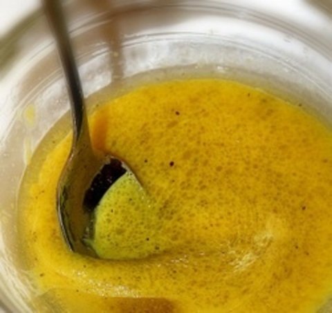 Vinagreta de mostaza. Ingredientes: Mostaza (2cp). Vinagre balsámico Módena (2cs). Aceite de oliva virgen (6 cs). Ajo (1 diente). Cebollino (unas hojas). Pimienta negra. Procedimiento: 1-Verter en un bol u otro recipiente de cocina la mostaza, el vinagre balsámico de Módena y el aceite de oliva. 2-Pelar el diente de ajo muy fino. Extraer y descartar el germen del interior. Rallar finamente. 3-Picar las hojas de cebollino. Incorporar en el bol. 4-Mezclar y triturar enérgicamente con ayuda de las varillas o el brazo de una batidora hasta emulsionar. 5-Salpimentar. 6-Remover. 7-Rectificar. Observaciones: 1-Algunos autores realizan modificaciones sutiles: incorporan las especias al principio junto con los ingredientes principales antes de triturar y/o incluyen otros ingredientes ( zumo de limón y/o diente de ajo y/o cebollino y/o miel), reemplazan algunos ingredientes por otros semejantes (pimienta blanca en lugar de negra, vinagre de manzana o de vino blanco o de arroz…en lugar de vinagre balsámico de Módena), modifican la secuencia temporal de incorporación de los ingredientes (añadir vinagre, sal; diluir, mostaza, pimienta y aceite de oliva virgen), 2-Las cantidades de los ingredientes principales (mostaza, vinagre y aceite) varían según los autores. 3-Se recomienda introducir las varillas o el brazo de la batidora hasta el fondo del recipiente y triturar sin levantar las varillas o el brazo de aquella. Conforme comienza a emulsionar desplazar las varillas o el brazo verticalmente de arriba hacia abajo. 4-Algunos autores sugieren verter muy lentamente un fino hilo de aceite de oliva después del vinagre y la mostaza para promover la emulsión.